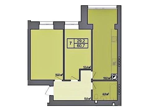 Площадь 2-комнатной квартиры - 60.7 м². Квартира расположена на типовом этаже 6-и этажного дома.