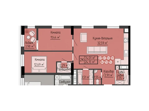 Современная планировка площадью - 74.01 м² создана специально для комфорта и уюта.