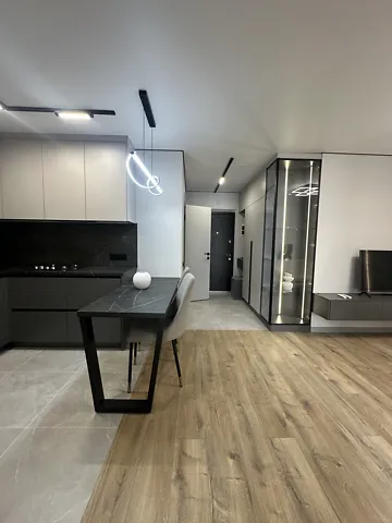 Кухня-студия полностью оснащена встроенной бытовой техникой, есть удобный диван и телевизор.