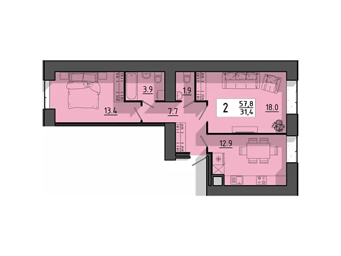 Площадь 2-комнатной квартиры - 57.8 м². Квартира расположена на типовом этаже 10-и этажного дома.