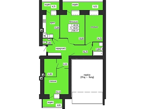 Площадь 3-комнатной квартиры - 109.17 м². Квартира расположена на 1 этаже 10-и этажного дома.