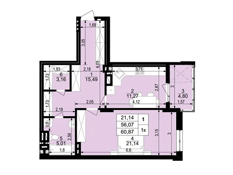 Эта современная комфортная планировка 1-комнатной квартиры с зонами для досуга и работы. Площадь 1-комнатной квартиры - 60.87 м².