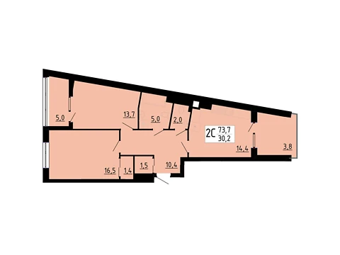 Площадь 2-комнатной квартиры - 73.7 м². Квартира расположена на 2 этаже 6-и этажного дома.