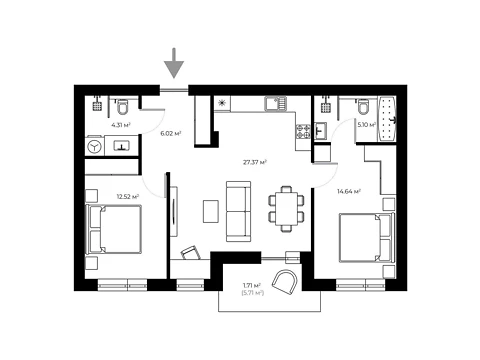 Площадь 2-комнатной квартиры - 71.2 м². Квартира расположена на 2 этаже 7-и этажного дома.