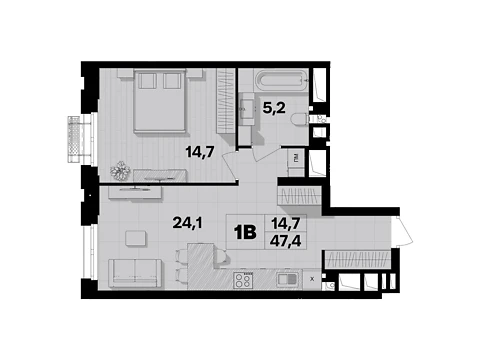 Эта современная комфортная планировка 1-комнатной квартиры с зонами для досуга и работы. Площадь 1-комнатной квартиры - 47.4 м².