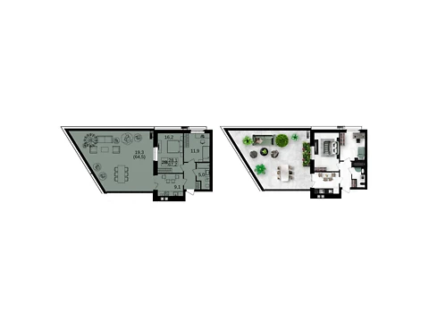 Эта современная комфортная планировка 2-комнатной квартиры с зонами для досуга и работы. Площадь 2-комнатной квартиры - 67.7 м².