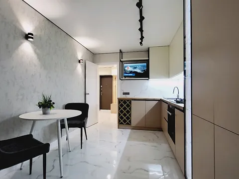 1кЕвроремонт.Мебель, двуспальная кровать с ортопедическим матрасом, два плазменных телевизора, холодильник LG, пральная машина , микроволновая печь, чайник, мебель на кухне, гардеробная ВСЕ остается.Хороший вид с балкона на закат солнца, на фото видно.Автономное отопление, теплый пол.