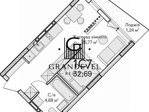 1-комнатная (студия). Общая площадь: 34 м².