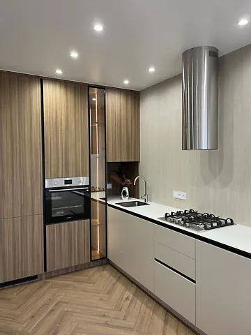 Кухня с TV зоной, которая отделана МДФ панелями. Есть вся необходимая техника (встроенный большой холодильник, посудомоечная машина, варочная поверхность, духовой шкаф, стиральная машина).