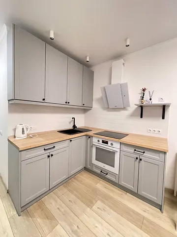 Кухня оборудована всем необходимым, продуманная планировка позволяет удобно использовать пространство.