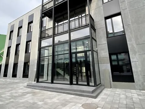 Современный офисный центр, имеющий хороший дизайн с элементами стиля Bauhaus.