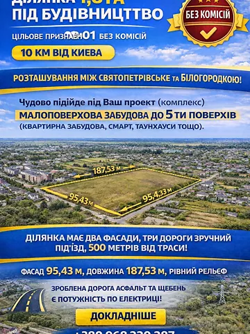 Предлагаю участок с фасадом на будущую кольцевую дорогу Киева. Хорошее место для устройства логистического центра/магазина/станции обслуживания автомобилей. Звоните, с радостью отвечу на вопросы.