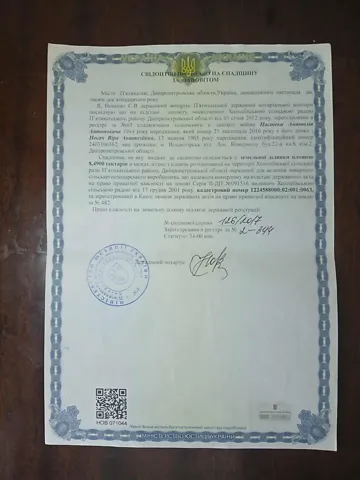Продажа земельного участка площадью 8.49 га; кадастровый номер 1224588000:02:001:0063; категория земель: земли сельскохозяйственного назначения; код целевого назначения: 01.01 Для ведения товарного сельскохозяйственного производства. Место расположения: Днепропетровская обл., Пятихатский р.