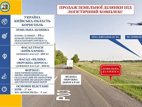 Продажа земельного участка с двумя фасадами дорог под логистический комплекс в Борисполе.