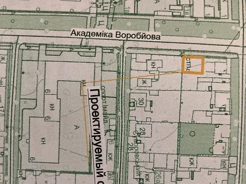 Участок угловой, по фасаду 13, 4м выходит на улицу Ак. Воробиова (ныне В.