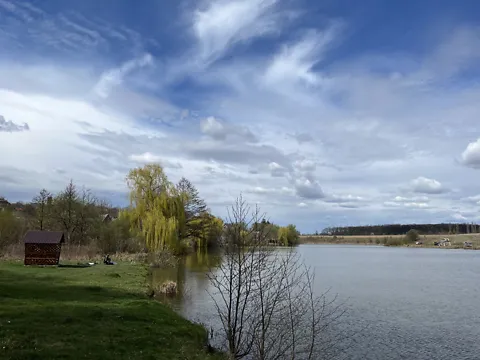 Рядом березовый рощ, озера с беседками.