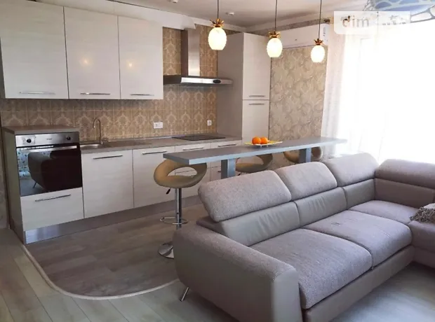 - просторная кухня-студия (25 м²) с барной стойкой, кожаными стульями, новым диваном-кроватью, выход на застекленный балкон.