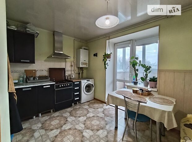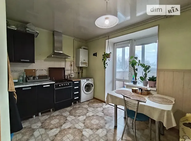 Просторная кухня с балконом, есть диван, стол, стиральная машина, газовая плита.