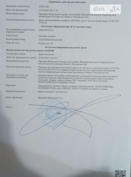 - Право аренды на земельный участок площадью 20,0000 га (пашня) кадастровый номер 5325185400:00:030:0008, который расположен за пределами населенных пунктов на территории Чернухинского поселкового совета Лубенского района Полтавской области.