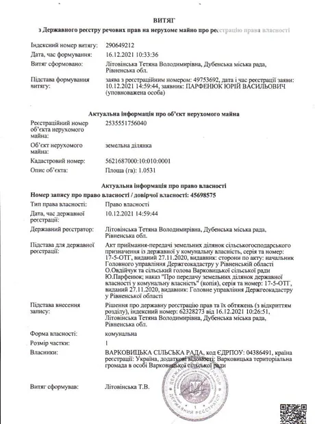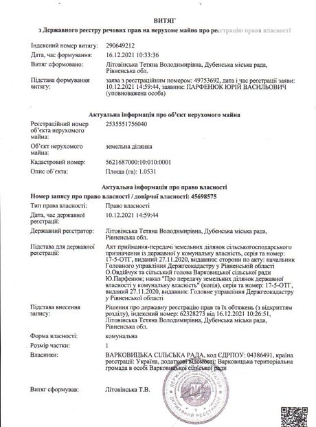 - Земельный участок для ведения товарного сельскохозяйственного производства (код согласно КВЦПЗ 01.01), за счет земель запаса сельскохозяйственного назначения коммунальной собственности Варковицкого сельского совета, площадью 1,0531 га, который находится по адресу: Ровненская обл., Дубенский р-н., Варковицкий сельский совет за пределами населенного пункта с. Олыбов, кадастровый номер 5621687000:10:010:0001.