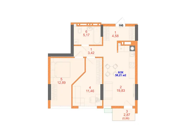 - Общая площадь 58.21 м²