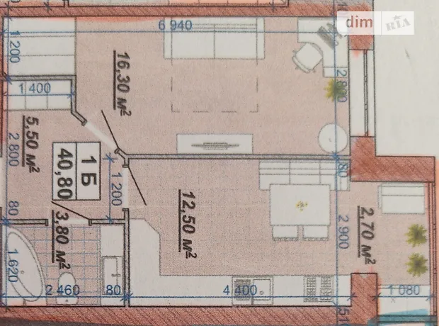 - Общая площадь 40.8 м² · жилая 16.3 м² · кухня 15.5 м²