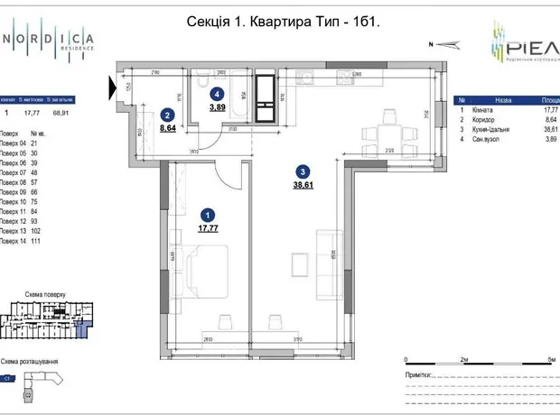 - Общая площадь 68.8 м² · жилая 17.8 м² · кухня 38.5 м²