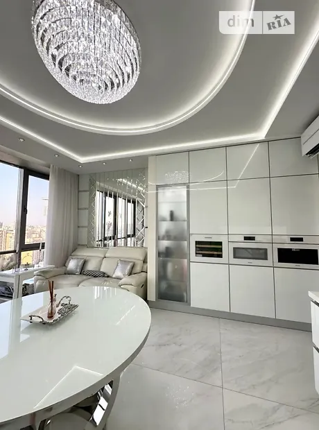 Просторная светлая квартира площадью 120 м² расположена на 19 этаже 23-этажного дома в престижном жилом комплексе с собственной набережной и живописным видом на Днепр.