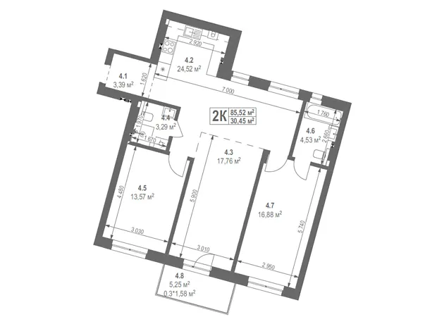 Эта современная комфортная планировка 2-комнатной квартиры с зонами для досуга и работы. Площадь 2-комнатной квартиры - 85.52 м².