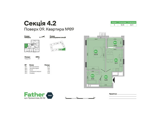 - Общая площадь 45.71 м²