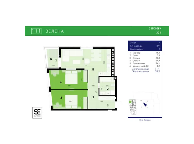 - Общая площадь 71.4 м²