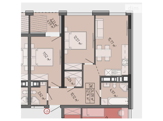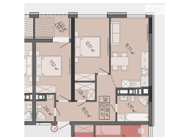 - Общая площадь 62.14 м²