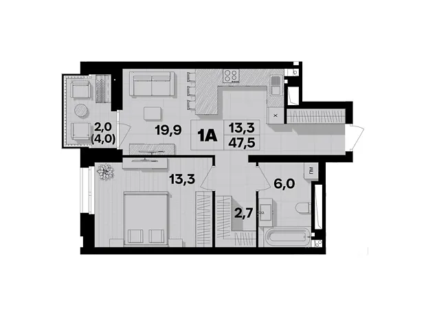 Площадь жилья данной планировки 47.5 м².
