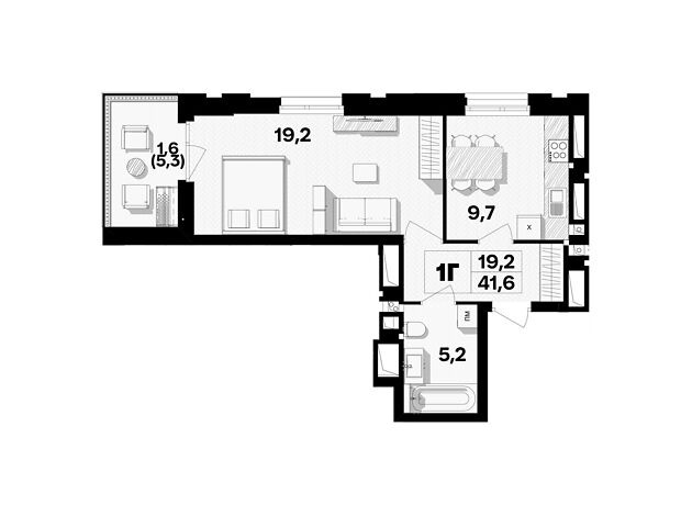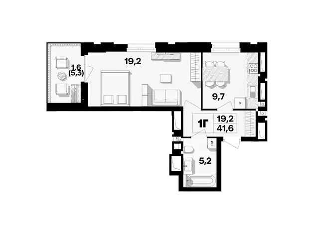 - Общая площадь 41.6 м²