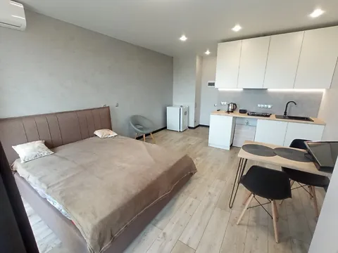 Ліжко з зручним, ортопедичним матрацом, стильне освітлення. Трендова декоративна штукатурка, мармуровий стіл і стільці з натуральної шкіри.
