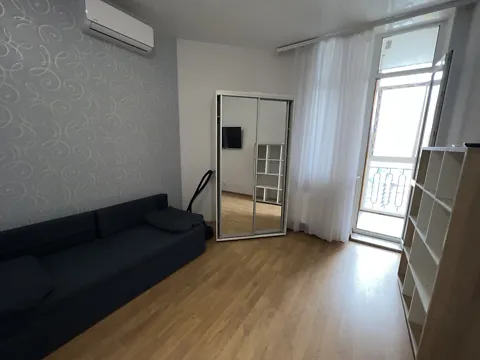 Розпланована на простору кухню-студію з кухонною зоною та зоною відпочинку, розділених барною стійкою. Є невеликий диван та телевізор. З кімнати вихід на невеликий балкон з боковим видом на море. Вся техніка вбудована. Також є 2 Смарт ТВ і 2 кондиціонери.