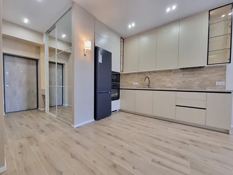 Красива кухня-студія розділена барною стійкою на спальну та кухонну зону, також є робоча зона з письмовим столом!