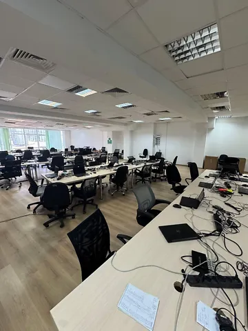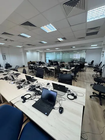 Офіс виконаний у сучасному стилі open space, що сприяє відкритій комунікації та командній роботі. Простора зала освітлюється великими вікнами, які забезпечують багато природного світла. У центральній частині розташовано робочу зону з кількома рядами робочих столів, кріслами та спільними зонами для обговорень.