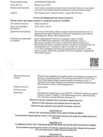 Оренда земельної ділянки сільськогосподарського призначення площею 6.7843 га, кадастровий номер 1823484000:06:000:0365, що розташована на території Чоповицької селищної ради Коростенського району Житомирської області, строком на 7 (сім) років, цільове призначення для ведення товарного сільськогосподарського виробництва, код класифікації видів цільового призначення земель – 01.01, вид використання земельної ділянки - рілля