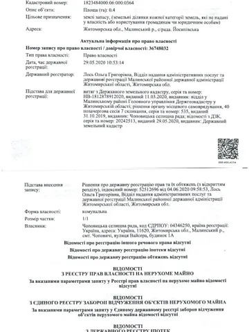 Оренда земельної ділянки сільськогосподарського призначення площею 0,4000 га, кадастровий номер 1823484000:06:000:0364, що розташована на території Чоповицької селищної ради Коростенського району Житомирської області, строком на 7 (сім) років, цільове призначення для ведення товарного сільськогосподарського виробництва, код класифікації видів цільового призначення земель – 01.01, вид використання земельної ділянки - рілля