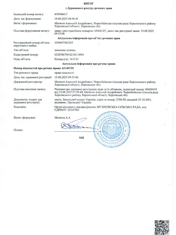 товарного сільськогосподарського виробництва, кадастровий номер 6520386700:02:001:0906, місцезнаходження: Херсонська область, Херсонський район, Музиківська сільська рада