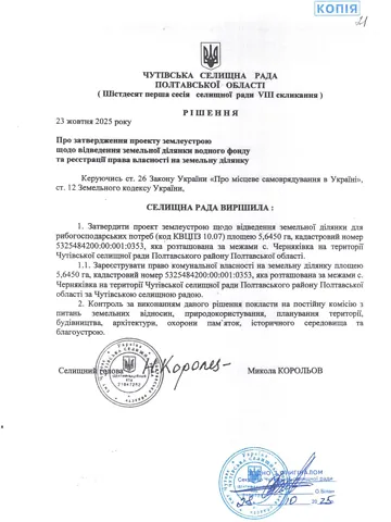 Право оренди на земельну ділянку комунальної власності водного фонду, в комплексі з розташованим на ній водним об’єктом (ставок), загальною площею 5,6450 га кадастровий номер 5325484200:00:001:0353, розташовану за межами с. Черняківка на території Чутівської селищної ради Полтавського району Полтавської області
