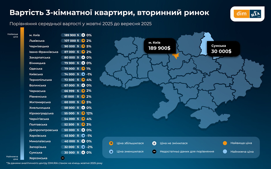 За даними DIM.RIA вартість вторинного житла продовжує зростати в більшості областей України. Найнижча середня ціна за однокімнатну квартиру фіксується у Запорізькій області — $17 тис. Найдорожче житло у Києві: середня вартість у жовтні становить $95 тис.