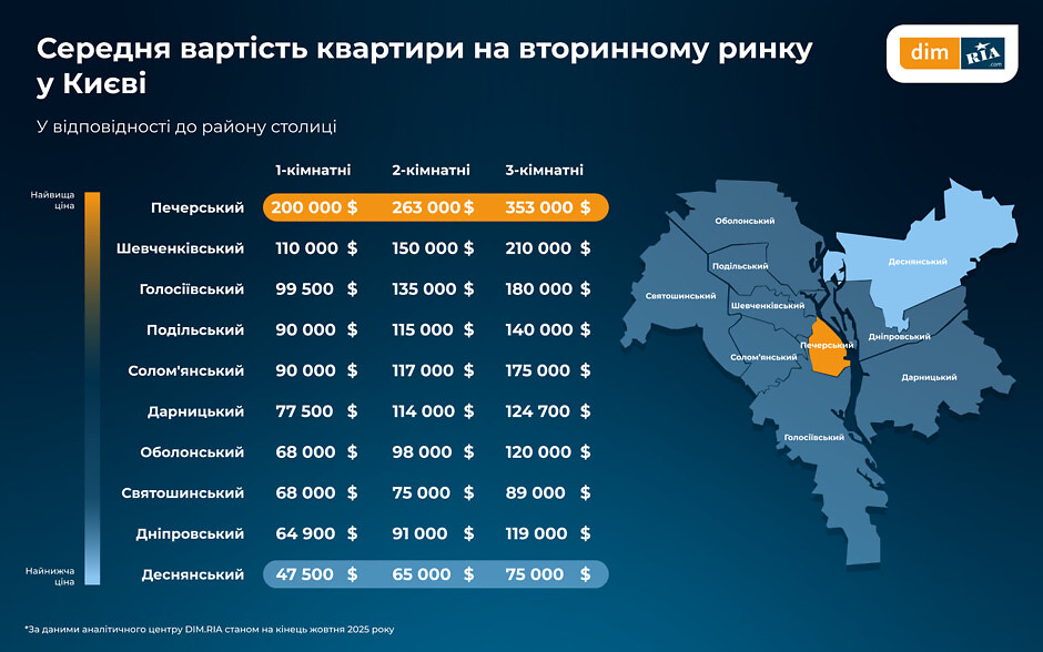 Якщо розглядати столицю детальніше, найдорожчим залишається Печерський район, де за однокімнатну квартиру в середньому потрібно заплатити $200 тис., а найбюджетнішим — Деснянський, де середня вартість становить $47,5 тис.