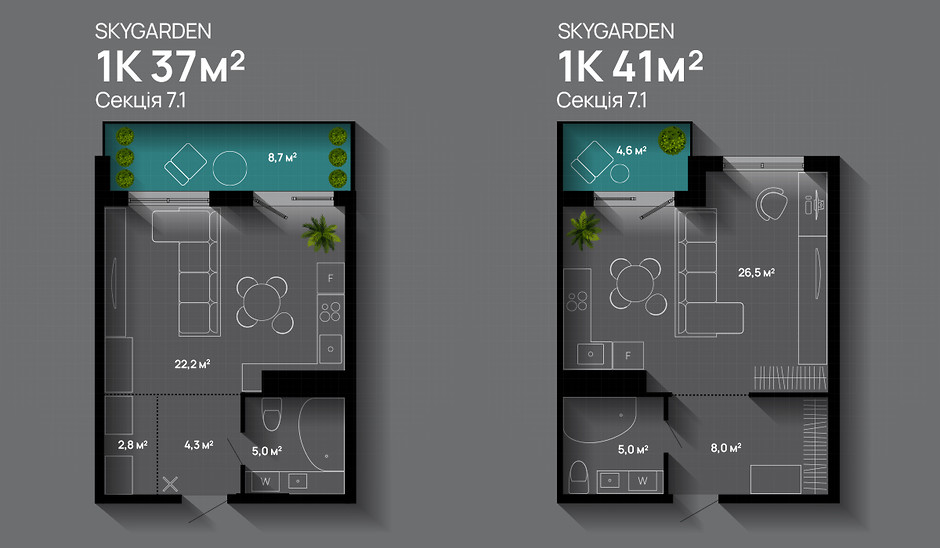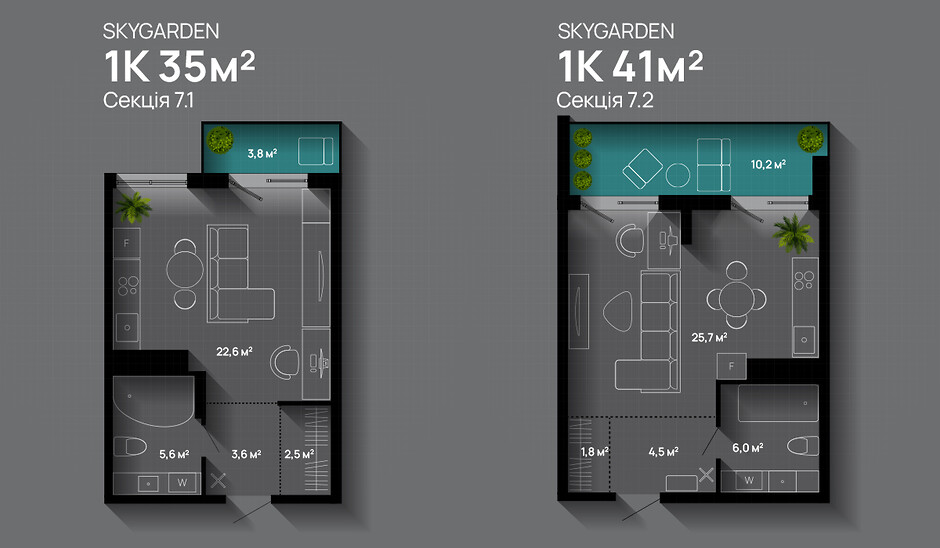 SKYGARDEN — це «живий» комплекс з власним озером і прибудинковою green-зоною площею 30 тис. кв. м. Також там спроєктовано закритий двір з великим дитячим майданчиком і спортивним полем, торговий центр, підземний паркінг і багато іншого для природно-інноваційного життя у пішій доступності до центру міста. Тут є можливість обрати квартиру-студію на видовому поверсі, з балконом, щоб бачити з вікна красиві краєвиди.