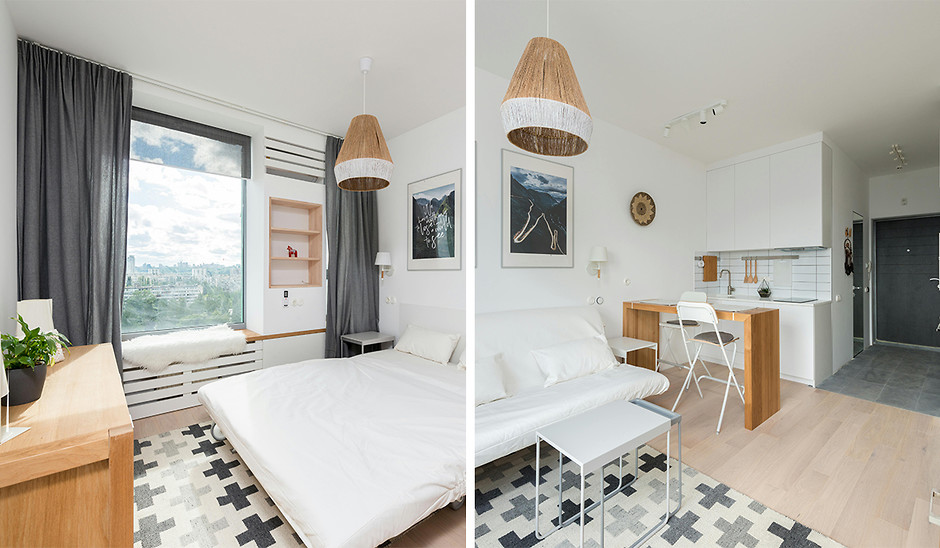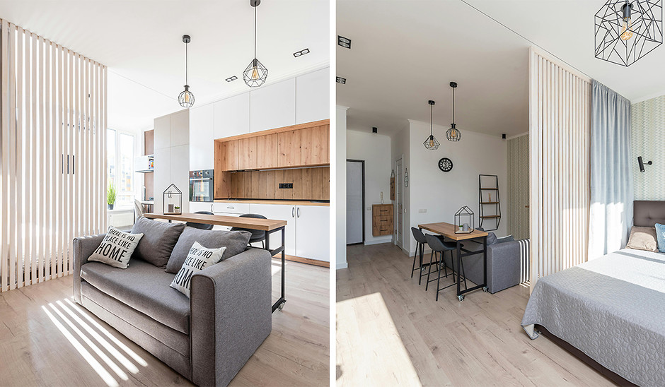 - Скандинавський стиль, який вирізняється пастельними, білими тонами, природними матеріалами та м'яким текстилем зробить вашу квартиру-студію дуже затишною. Світлі кольори візуально збільшать простір, а дерев'яні елементи додадуть теплоти та природності.