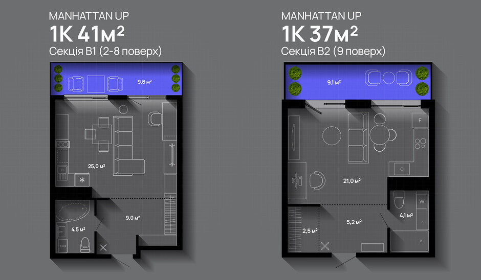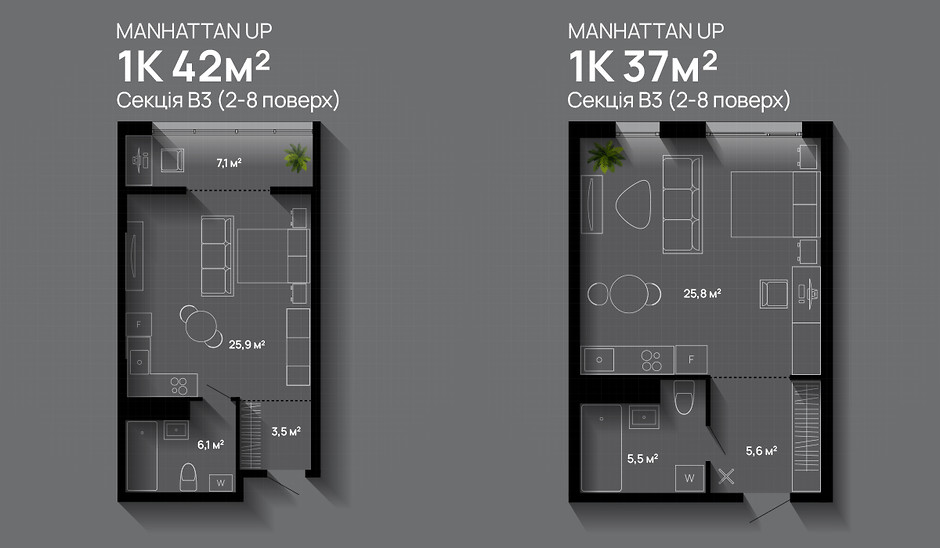 Manhattan UP - комплекс на етапі будівництва, який складатиметься з унікальних шести кварталів із зеленими закритими від авто дворами, розвиненою інфраструктурою, підземним паркінгом, басейнами на даху кожного будинку та з багатьма іншими унікальними рішеннями. Тут спроєктовані квартири-студії з балконами або лоджіями. Вікна панорамні, на всю площу зовнішньої стіни. Це забезпечить велику кількість природного освітлення та тепла.