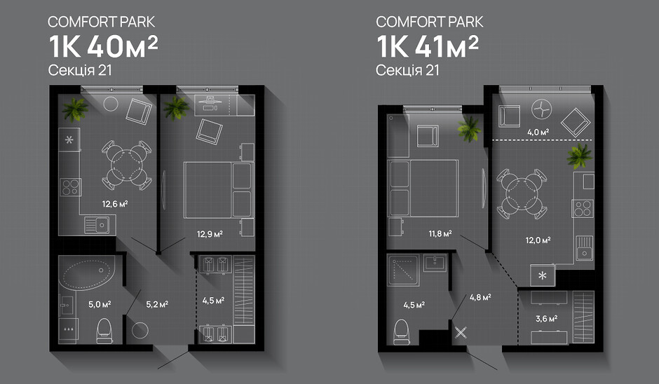 ЖК Comfort Park розташований в мікрорайоні Пасічна, поруч з річкою. Тут на вас чекають входи та виходи в будівлі врівень з землею, без сходинок чи інших підвищень, безключовий вхід у під’їзд, освітлені дизайнерські холи, декоровані деревʼяними ламелями, великі комфортні ліфти. У цьому ЖК ми пропонуємо однокімнатні квартири з вільним плануванням. Тобто ми можемо не зводити стіни між кухнею та відпочинковою зоною, створивши для вас простору квартиру-студію.