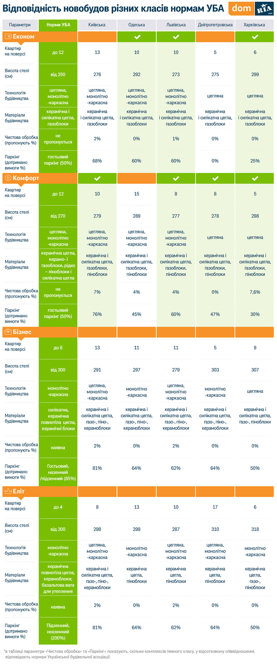 Для порівняння були взяті п’ять українських міст-мільйонників, адже саме в них представлений найбільший вибір всіх класів новобудов. До основних характеристик були віднесені: кількість квартир на поверсі, висота стель, технології та матеріали будівництва, наявність чистової обробки стін та наявність паркувальних місць.