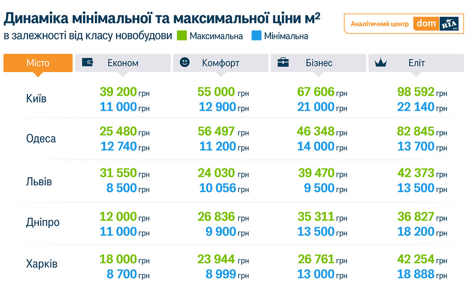 Аналітичний центр також дослідив цінову політику в містах-мільйонниках та встановив залежність мінімальної та максимальної ціни квадратного метра від класу новобудови.